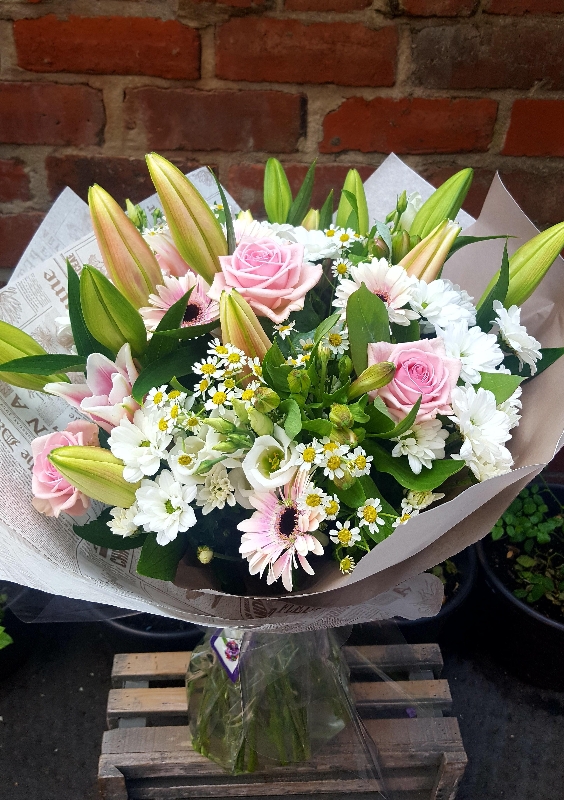 Pretty pastel pink and white hand-tied bouquet featuring Lilies, Roses and Germini, Lisanthus and Alstromeria.  Delivered aqua packed for maximum freshness.