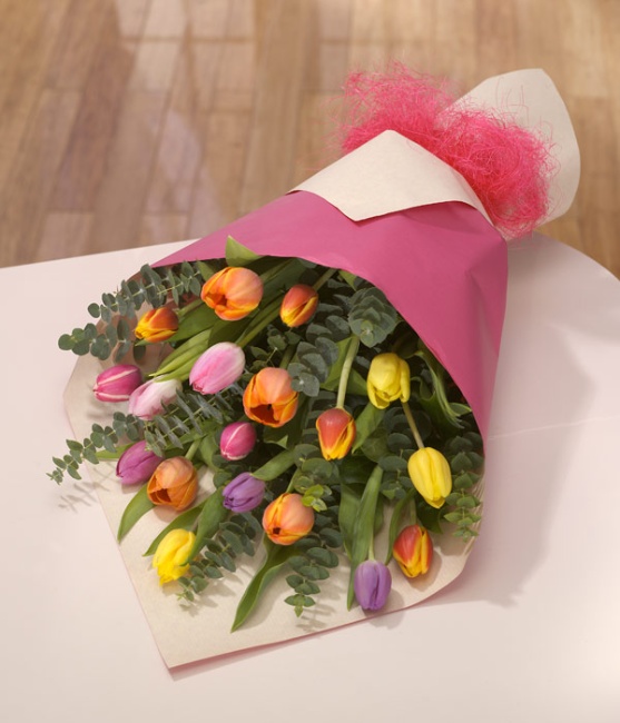 Beauty can be simple - a wrap of mixed Tulips and foliage tied with sisal.