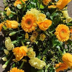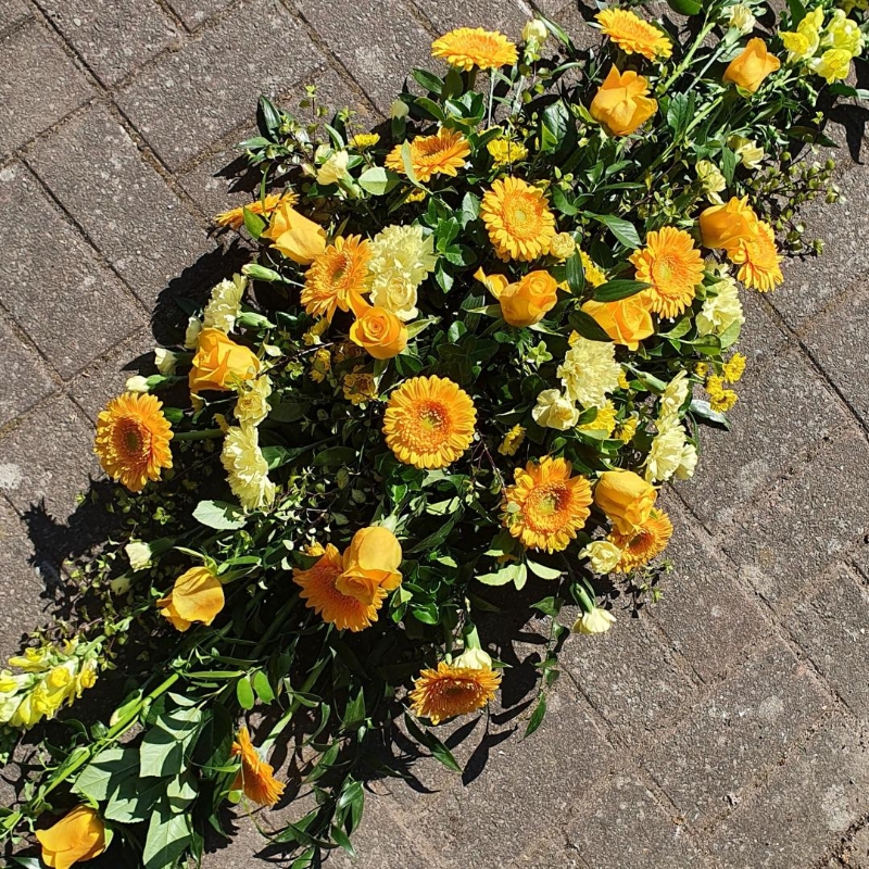 A casket spray in shades of gold, yellow and orange using seasonal flowers including roses. Can be made in a variety of sizes.