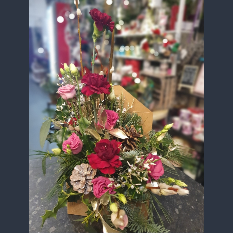 An exquisite Christmas arrangement in a cardboard envelope container.  Made in oasis to ensure long life using seasonal foliage,  burgundy carnations, pussy willow, pink lisianthus, with a touch of sparkle.  For the higher priced one, we will use burgundy roses.