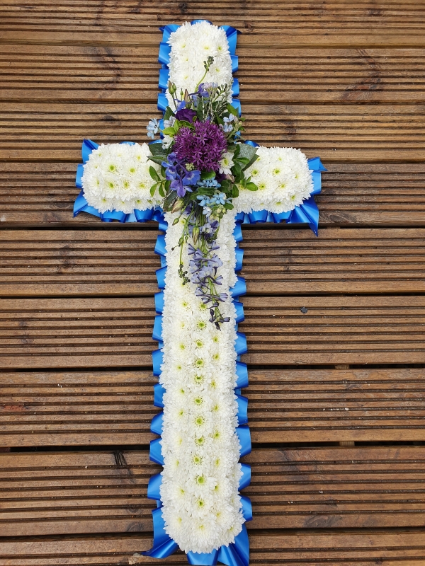 A cross for a funeral based in white double chrysanthemums with a colourful spray co-ordinating with the ribbon edge.  This cross can be made in your choice of ribbon colour and flower spray colour.